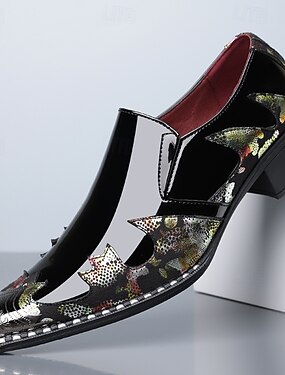 メンズフェイクレザーのアーティスティックなウェディングシューズ - ブラックとマルチカラーのクロコダイルプリントにユニークなディテール、結婚式や特別なイベントにぴったりの大胆でクリエイティブなシューズ