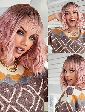 人工毛ウィッグ ナチュラルウェーブ ボブスタイル・ヘアカット ニートバング かつら 12 インチ ブラックピンク 合成 女性用 マルチカラー 多色