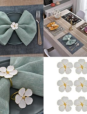 フラワーナプキンリング6個セット、ゴールドベース付きホワイトフローラルナプキンリングホルダー、ウェディングパーティーテーブルセッティングディナー用のエレガントな金属製ナプキンバックル、ファームハウスホームキッチン装飾アクセサリー