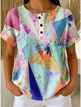 レディース ワッフル テクスチャ ニット トップス T シャツ オンブレ グラフィック ジオメトリ スタイリッシュ クラシック 半袖 クルーネック ヘンリー ロング トップス デイリー スポーツ カーキ レインボー ライトブルー 夏 春