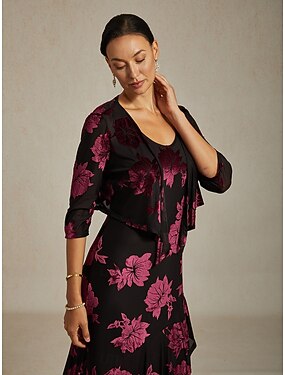 女性用 肩をすくめる フラワー エレガント ヴィンテージ 七分袖 Vネック パーティー 結婚式のゲスト パーティーイブニングウェア ワイン 秋 冬