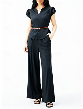 女性用 パンツセット 半袖 Vネック 純色 エレガント ファッション ストリートファッション ビジネス オフィス ワーク ブラック ワイン ベージュ 夏 レギュラー