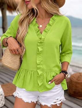 女性用 シャツ ブラウス フリルシャツ ラッフル パッチワーク 純色 平織り スタイリッシュ クラシック 近代の 長袖 Vネック レギュラートップス 日常 祝日 お出かけ ブラック ホワイト ルビーレッド スカイブルー グリーン 夏 春