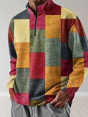 男性用 幾何学模様 ワッフル スウェットシャツ 日常 クラシック カジュアル スタンド アウトドア 家 ワーク 贈り物 ブルー イエロー オレンジ グリーン ボタン 秋 冬 デザイナー S M L XL XXL XXXL