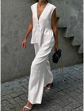 女性用 シャツ パンツセット ノースリーブ Vネック 純色 レース パッチワーク 活発的 ボヘミアン カジュアル/普段着 ブラック アーミーグリーン ブルー 夏 レギュラー
