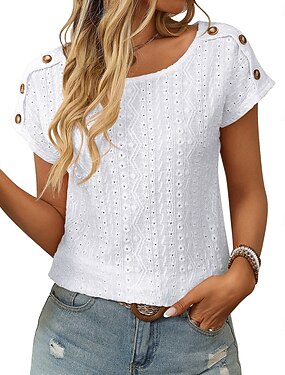 女性用 Tシャツ アイレット刺繍 T シャツ パッチワーク アイレット ボタン クラシック カジュアル 半袖 バットウィングスリーブ クルーネック ラウンドネック レギュラートップス 日常 週末 ブラック ホワイト ライトグリーン ピンク ピーチ 夏 春