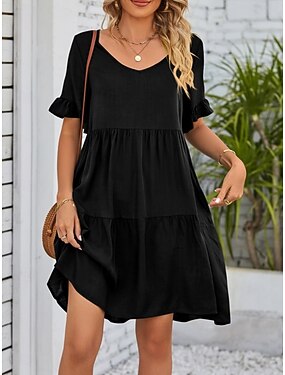 女性用 ミニドレス サンドレス カジュアルドレス ラッフルドレス エレガント ファッション 近代の アウトドア バケーション お出かけ ルーズフィット 平織り 半袖 Vネック ブラック ピンク ルビーレッド ネイビーブルー 夏 春