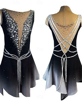 フィギュアスケート ドレス 女性用 女の子 アイススケート ドレス パッチワーク オープンバック メッシュ スパンデックス 伸縮性あり 訓練 レッスン用 プロフェッショナル スケートウェア 保温 クリスタル・ラインストーン ノースリーブ アイススケート フィギュアスケート