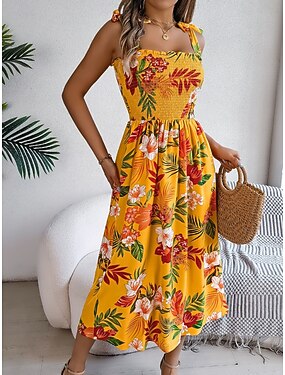 女性用 ミディドレス ビーチドレス A ラインドレス 花柄ドレス スリップドレス エレガント ファッション 近代の アウトドア ビーチ バケーション レギュラー フラワー ノースリーブ スクエアネック ブルー イエロー グリーン 夏 春