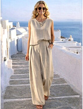 女性用 パンツセット フェイクコットンリネン ノースリーブ クルーネック 平織り エレガント ファッション ストリートファッション カジュアル 日常 アウトドア ブルー ブラック オレンジ 夏 レギュラー