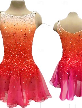 フィギュアスケート ドレス 女性用 女の子 アイススケート ドレス オレンジ 指穴付き ハロ染色 高弾性 プロフェッショナル 競技大会 スケートウェア 保温 クリスタル・ラインストーン ノースリーブ アイススケート フィギュアスケート