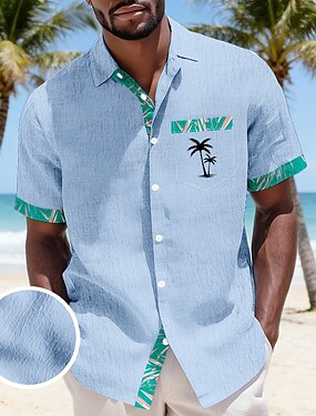 男性用 多色 ココナッツの木 熱帯植物 アロハシャツ ボタンアップシャツ 半袖 ハワイアン バケーション 祝日 ビーチウェア 夏 春 折襟 3Dプリント リネンライクシャツ ブルー パープル グリーン