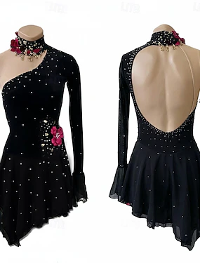 フィギュアスケート ドレス 女性用 アイススケート ドレス ブラック パッチワーク オープンバック 高弾性 訓練 競技大会 スケートウェア クラシック クリスタル・ラインストーン 長袖 アイススケート フィギュアスケート