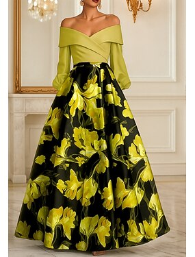 Aライン フロア丈 セミロング丈 カクテルドレス イブニングドレス パーティードレス エレガント きらびやかな セレブスタイル 半袖 オフショルダー ガーデンパーティー 結婚式 サテン ストレッチサテン とともに 刺繍 アップリケ