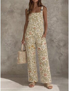 女性用 100% コットンダンガリー アクティブ フローラル スリーブレスタンク スリーブレスタンク ワイドレッグ スクエアネック ポケット付き デイリービーチルーズフィット ブルー ピンク グリーン 夏