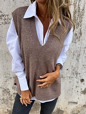 女性用 ニット セーターベスト ストリートファッション カジュアル 純色 Vネック ニット ノースリーブ レギュラートップス ニット 日常 祝日 お出かけ ブラック ライトブラウン 秋 冬