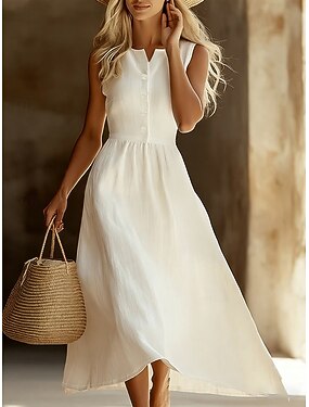 女性用 ミディドレス シャツドレス 白いドレス エレガント ファッション 近代の アウトドア バケーション お出かけ レギュラー 平織り ノースリーブ Vネック ホワイト 夏 春