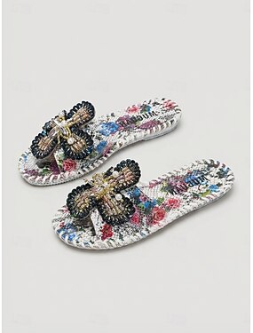 女性用花柄スライドサンダル、ビーズの蝶飾り付きフラットサンダル(バケーションディナー、リゾートでの夜に最適) &夏のパーティー