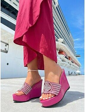 ラインストーンのディテールが施されたレディースのピンクのウェッジサンダル - 島やクルーズ旅行にぴったりのスタイリッシュなフットウェア
