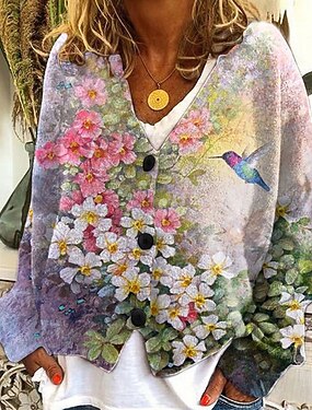 女性用 コート カジュアルジャケット 保温 快適 プリント ファッション 近代の カジュアル フラワー お出かけ 週末 シングルブレスト レギュラー Vネック レギュラー 長袖 アウターウェア イエロー ピンク グリーン 秋 冬