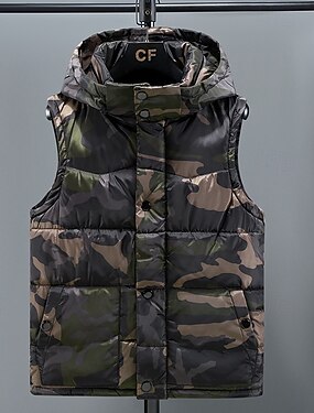 男性用 パファーベスト ベスト ジレ バケーション 日常 デート ファッション カジュアル 冬 ポケット ポリエステル 保温 快適 カモフラージュ ジッパ- フード付き レギュラー ブラック グリーン ライトグレー ベスト