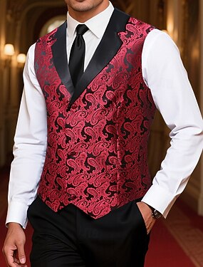 男性用 ベスト チョッキ ジレ バケーション パーティー ビジネス ファッション カジュアル 春 秋 ポケット ボタン ポリエステル 快適 ペーズリー シングルブレスト 一つボタン ピークドラペル レギュラー ルビーレッド ベスト
