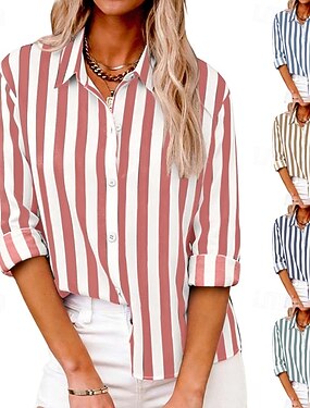 女性用 シャツ コットンリネンシャツ ブラウス パッチワーク ボタン ストライプ スタイリッシュ クラシック 近代の 長袖 シャツカラー レギュラートップス 日常 祝日 お出かけ ブルー ピンク グリーン カーキ色 ダークブルー 夏 春