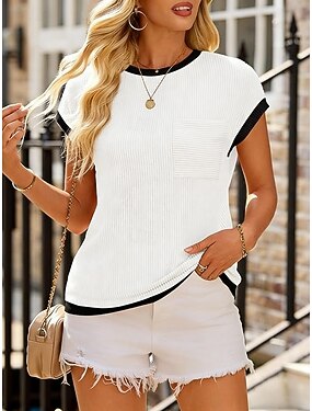 女性用 リブニットトップス パッチワーク ポケット カラーブロック スタイリッシュ カジュアル 半袖 キャップ クルーネック ラウンドネック ロングトップス 日常 お出かけ ブラック ホワイト アーミーグリーン 夏 春