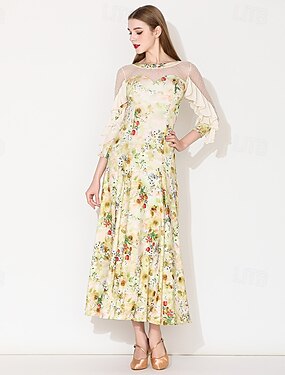 ボールルームダンス ドレス フラワープリント プリーツ スプライシング 女性用 パーティー 訓練 性能 長袖 スパンデックス ポリエステル