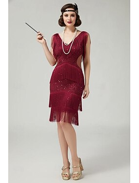 20代の轟音 1920年代風 膝丈 フラップワンピース ノー・スリーブ グレートギャツビー スパンコール フリンジ Vネック 仮装 女性用 クリスマス カーニバル マスカレード レトロテーマパーティー チャールストンダンス 成人 ドレス