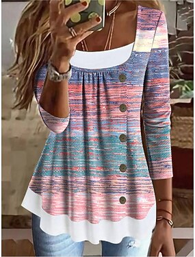 女性用 Tシャツ パッチワーク ボタン プリント オンブル’ グラフィック ヴィンテージ スタイリッシュ クラシック 長袖 スクエアネック ロングトップス 日常 週末 ブルー ルビーレッド パープル グリーン 春 秋 冬