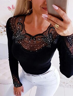女性用 夏のトップス ブラウス ドレッシーなトップス フリル パッチワーク メッシュ 平織り エレガント ヴィンテージ レディース 長袖 クルーネック レギュラートップス 日常 ワーク 祝日 ブラック 夏 春