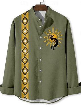 男性用 エスニック ココペリ シャツ ボタンアップシャツ 長袖 ヴィンテージ カジュアル トライバル風 日常 バケーション 夏 春 & 秋 スタンドカラー ボタンアップ 3Dプリント ブルー グリーン カーキ色 ベージュ