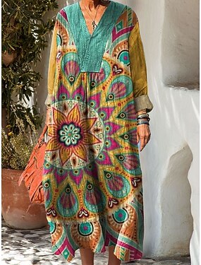 ウィメンズ マキシドレス リネンライク シフトドレス カジュアル デイリー ルーズフィット グラフィック ジオメトリック 長袖 Vネック ブルー オレンジ グリーン ローズピンク サマー スプリング