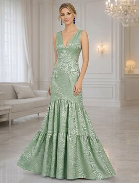 Aライン トランペット/マーメイド フロア丈 イブニングドレス エレガント フローラル ノースリーブ Vネック パーティー 結婚式 ポケット サテン ジャカード とともに ラッフル
