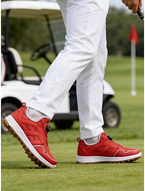 メンズレッドゴルフシューズ、軽量で通気性のあるアッパー、衝撃吸収ソール、ゴルフコースやアウトドアスポーツに最適なアスレチックパフォーマンススタイル