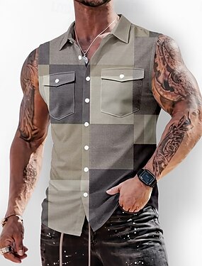 男性用 幾何学模様 カラーブロック パッチワーク シャツ ボタンアップシャツ ノースリーブシャツ ノースリーブ ファッションカジュアル 日常 バケーション 夏 春 折襟 3Dプリント フロントポケット2つ ブルー グリーン カーキ色