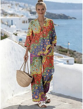 女性用 ツーピースセット パンツセット ボレロトップ 七分袖 Vネック グラフィック 幾何学模様 プリント 日常 スタイリッシュ カジュアル 日常 バケーション ピンク パープル オレンジ 夏 レギュラー