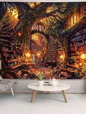ファンタジー魔法の木図書館壁掛けタペストリー古代ツリーハウス本棚壁掛け螺旋階段暖色光アート読書コーナー寝室書斎装飾用大型ファブリックポスター