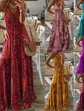 女性用 ロングドレス マキシドレス カジュアルドレス 花柄ドレス スリップドレス プリントドレス エレガント ファッション 近代の 日常 バケーション お出かけ レギュラー フラワー 幾何学模様 ノースリーブ Vネック イエロー ピンク ワイン ルビーレッド 夏