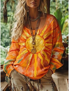 女性用 ボヘミアン T シャツ Tシャツ ティートップ プリント グラフィック ヴィンテージ エスニック カジュアル 長袖 Vネック レギュラートップス 日常 週末 バケーションウェア イエロー ルビーレッド オレンジ グリーン レインボー 春 秋