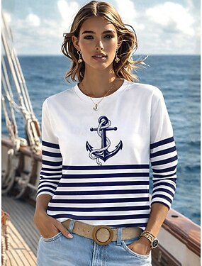 女性用 Tシャツ プリント グラフィック 幾何学模様 海洋 ヴィンテージ ファッション スタイリッシュ 長袖 クルーネック レギュラートップス 日常 ブルー ブラック ピンク ルビーレッド グリーン 夏 春