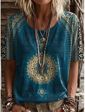 女性用 Tシャツ プリント フラワー グラフィック 幾何学模様 ヴィンテージ スタイリッシュ カジュアル 半袖 Vネック ロングトップス カジュアル 日常 週末 ブルー ブラック ルビーレッド 夏 春