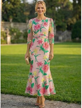 タイト/コラム アンクル丈 パーティードレス 二次会ドレス / カクテルドレス カクテルドレス エレガント ヴィンテージ フローラル 七分袖 クルーネック フォーマル 結婚式のゲスト オーガンザ とともに 刺繍の花 フリル