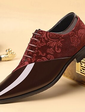滑らかなフェイクレザーのコントラストとローヒールが特徴のメンズ バーガンディ エンボス オックスフォード シューズ。ビジネス、結婚式、イベントに最適なエレガントなフォーマル ドレス シューズです。