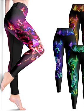 女性用 ヨガパンツ バットリフト おなかコントロール ハイウエスト ジムトレーニング ランニング フィットネス クロップドレギンス バタフライ イエロー レッド ブルー 秋 冬 スポーツ アクティブウェア 高弾性 タイト