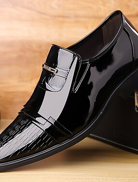 バックルディテールの光沢のあるブラックのパテントレザーのメンズローファー。フォーマルなイベントや結婚式にぴったりのエレガントなドレスシューズです。