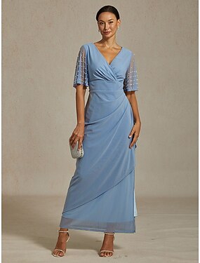 女性用 マキシドレス シースドレス エレガント プリーツ 純色 半袖 長袖 Vネック ダスティブルー