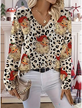 女性用 ニット プルオーバー ファッション ストリートファッション カジュアル グラフィック レオパード サンタクロース Vネック 特大の ニット 長袖 レギュラートップス ニット アウトドア 日常 カーキ色 春 秋