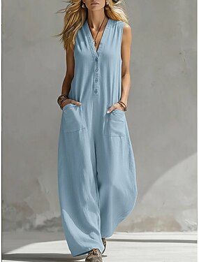 女性用 プレイスーツ ストリートファッション 純色 ノースリーブ ワイドレッグ Vネック ポケット 日常 バケーション レギュラー ブラック アーミーグリーン ルビーレッド 夏